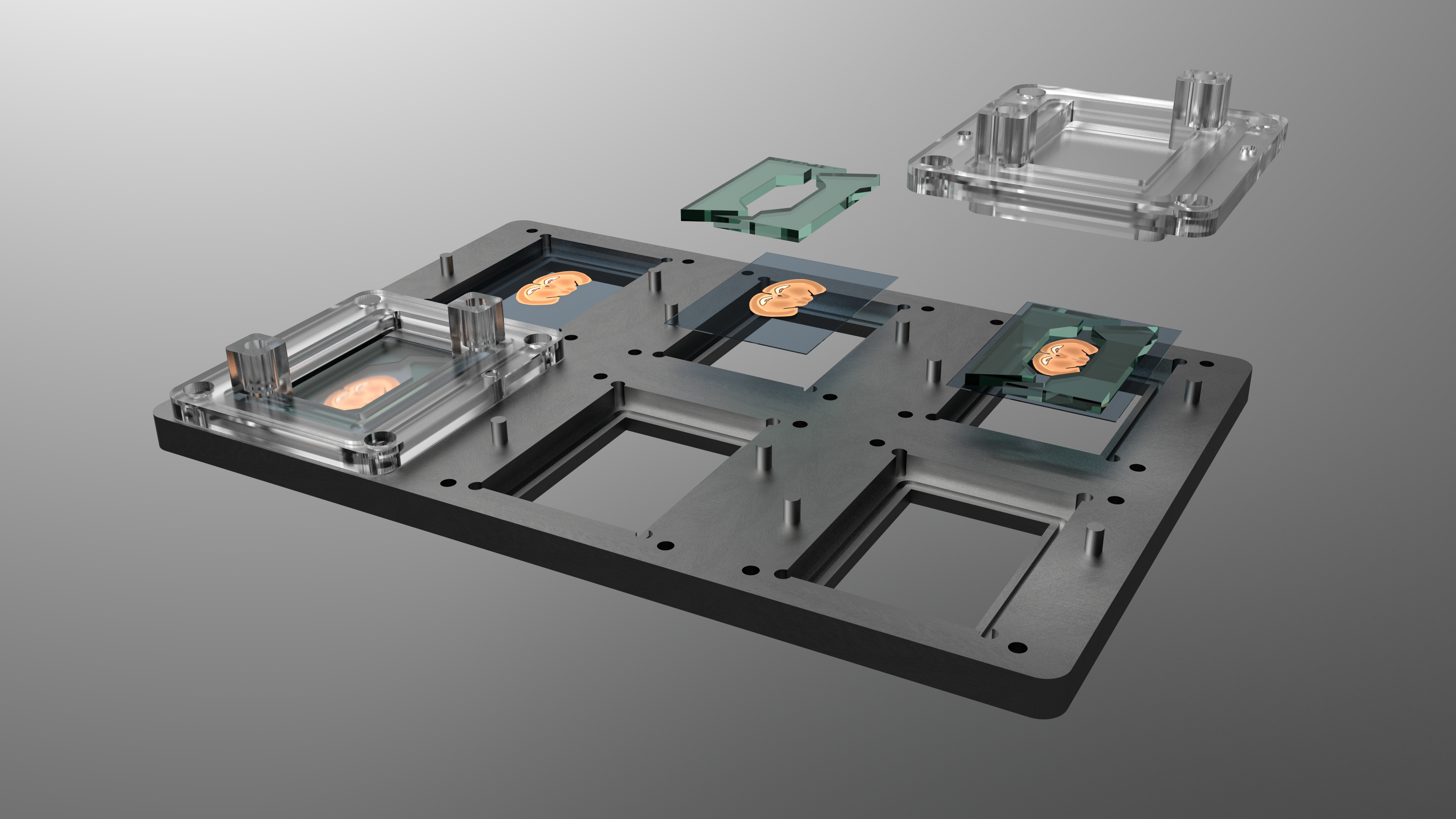 The 6 chamber flow cell that we use has been developed together with microliquid. This is the 3D model of the base and the lids, but if you want to use the chambers we strongly advise to contact Microliquid to have them make a reproduction.