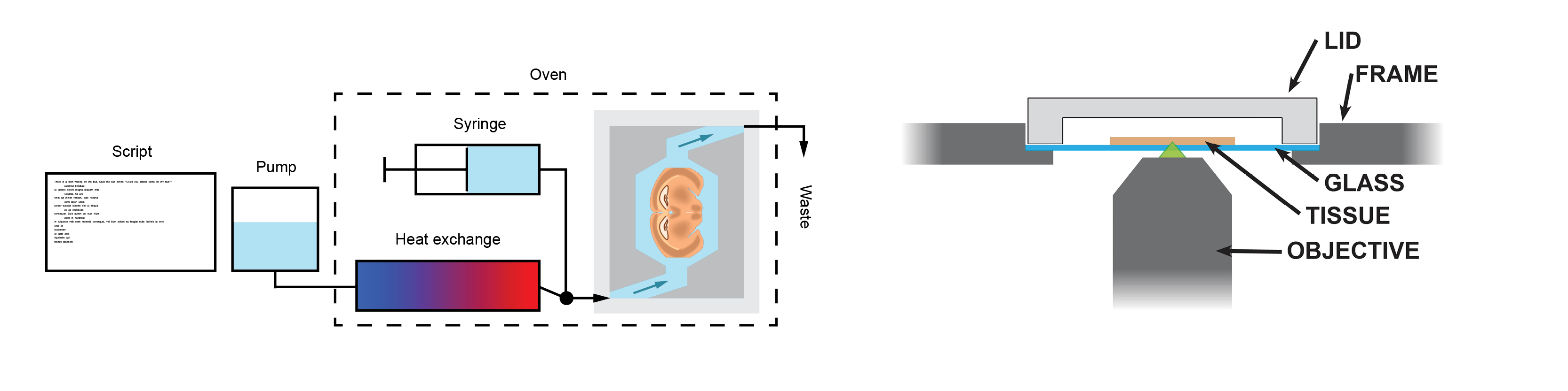 1 - Either you make your own flow cell or use a different flow cell that can be placed in the stage repeatedly without displacement. The easiest setup we can think of is a plate of polycarbonate in the shape of a microtiter plate so that it can be placed in the microscope stage. Drill two small holes through the plate, these will be the liquid inlet and outlet. Then, stick thick double sided tape in the shape of a flow cell on the bottom and place the glass with your tissue on to close the flow cell.