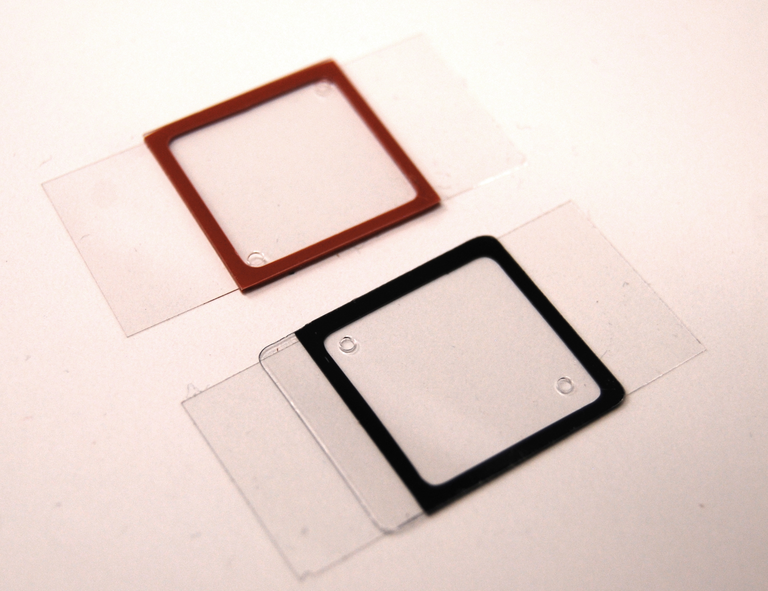 As simple flow cell alternative, we have been using Grace Bio-labs hybridization chambers. This are stickers that can be placed on top of the glass with the sample to form a flow cell. The models we used are the black HybriWell and the orange Secure Seal. The black ones have a smaller vollume but are harder to remove from the glass than the orange chambers.